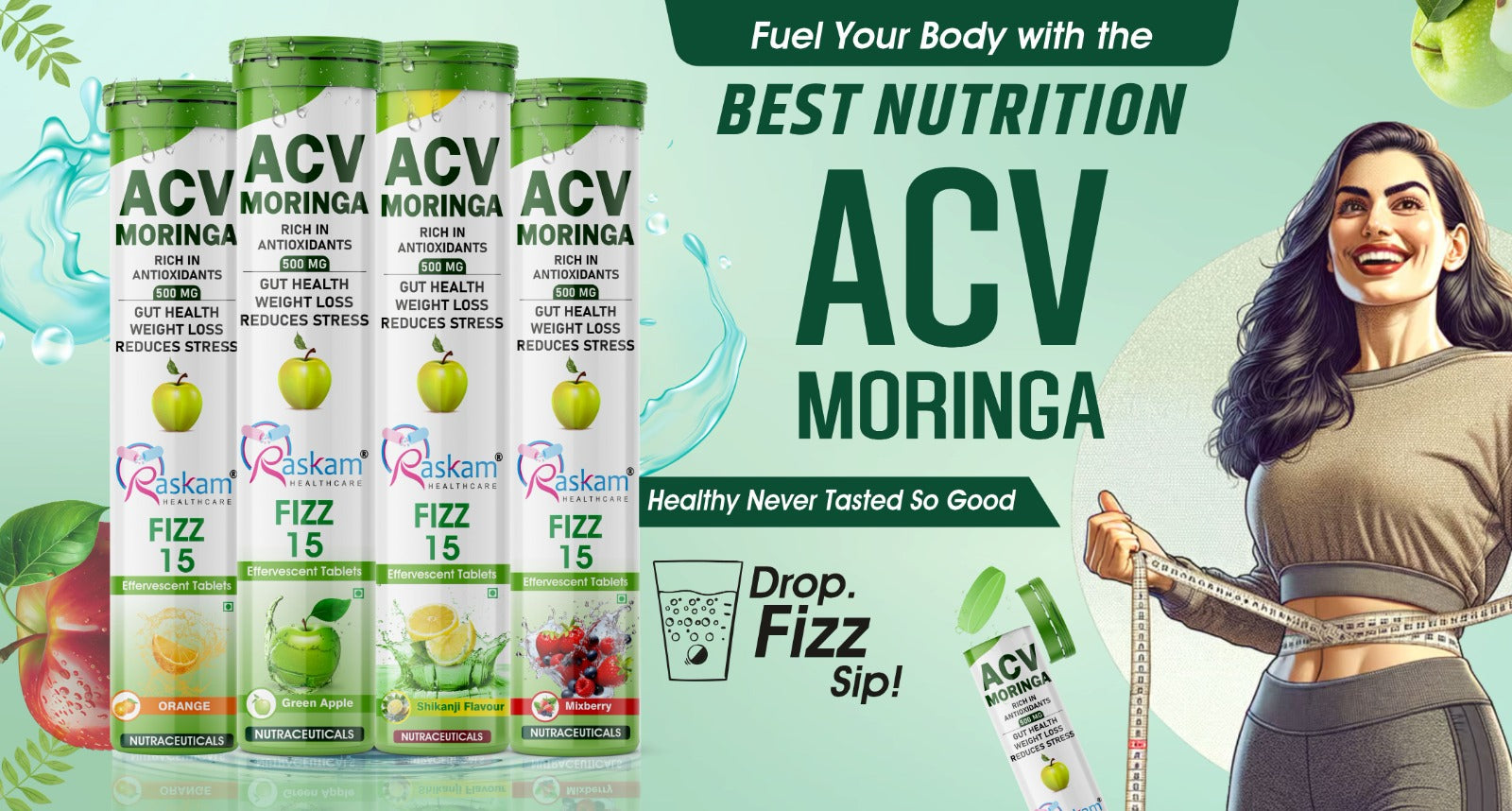 Raskam Apple Cider Vinegar (ACV) Moringa | Master Your Appetite & Boost Immunity | Natural Energy with Antioxidants | No Added Sugar | Shikanji Flavor | 15 Fizz Tablets (500mg)