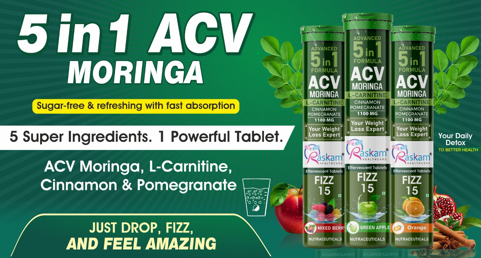 Raskam ACV Moringa 5 in 1 formula Effervescent Tablets Helps To Turn Fat Into Energy | With Carnitine, Pomegranate & Cinnamon | Supports Fat Burn | Weight Loss Drink for Women, Men | No Added Sugar | Orange Flavor | 15 Fizz Tablets (1100mg)