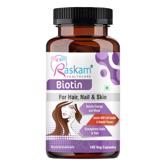 Raskam Biotin - 100 Veg Capsules - Hair Growth, Strong Hair and Glowing Skin, Fights Nail Brittleness