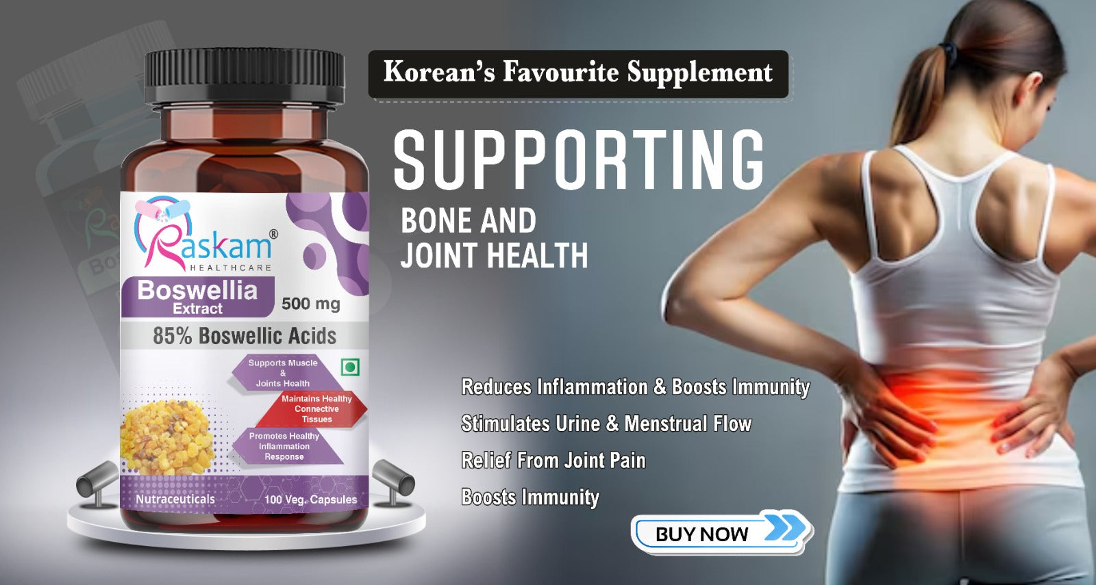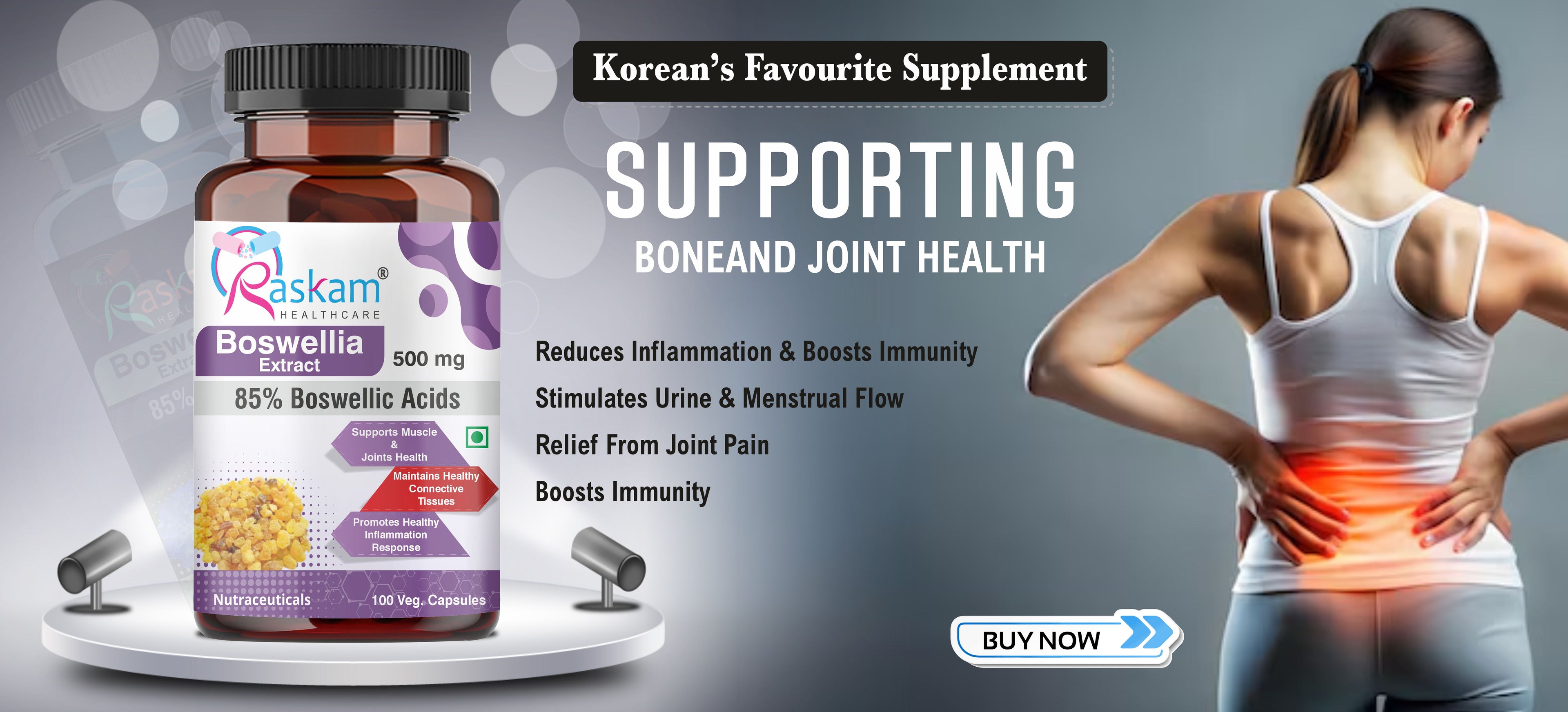 Unlock the secret to holistic wellness with Raskam Boswellia Serrata capsules. Cherished by Korean for its remarkable results , these capsules offer natural joint relief and support. Experience the transformative benefits trusted by discerning individuals seeking premium health solutions.