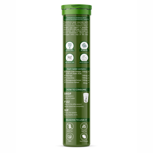 Raskam ACV Moringa 5 in 1 formula Effervescent Tablets Helps To Turn Fat Into Energy | With Carnitine, Pomegranate & Cinnamon | Supports Fat Burn | Weight Loss Drink for Women, Men | No Added Sugar | Orange Flavor | 15 Fizz Tablets (1100mg)
