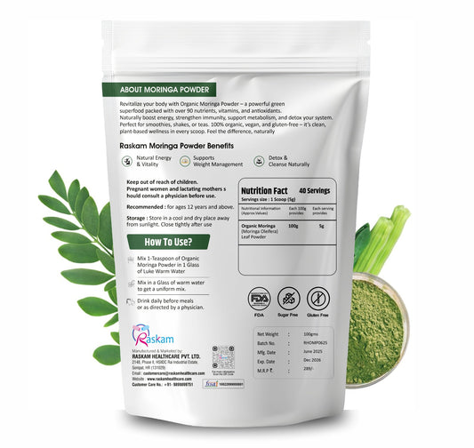 Raskam 100% Organic Moringa Powder - Moringa Oleifera | Moringa Leaves Powder | Organic Moringa Powder for Immunity, Digestion & Energy | Organic Super green for Vitality, Gut Health |Drumstick Leaves Powder - 100g