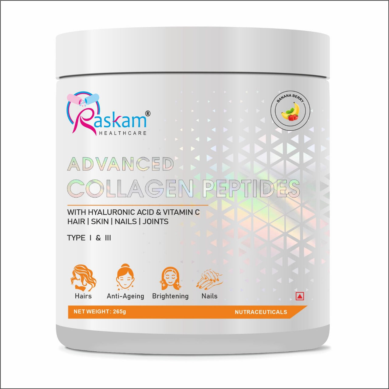 Raskam Advanced Collagen Peptides Powder for Men & Women | Collagen Powder with Biotin, Vitamins C & E for Hair, Nails, Skin Radiance & Anti-Aging Flav- Banana Berry (100gm , 265 gm)