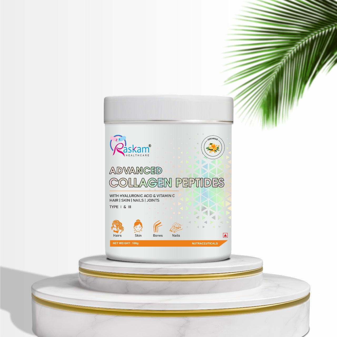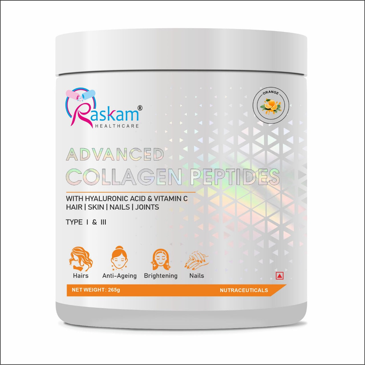 Raskam Advanced Collagen Peptides Powder for Men & Women | Collagen Powder with Biotin, Vitamins C & E for Hair, Nails, Skin Radiance & Anti-Aging Flav- Orange (265gm ,100gm)