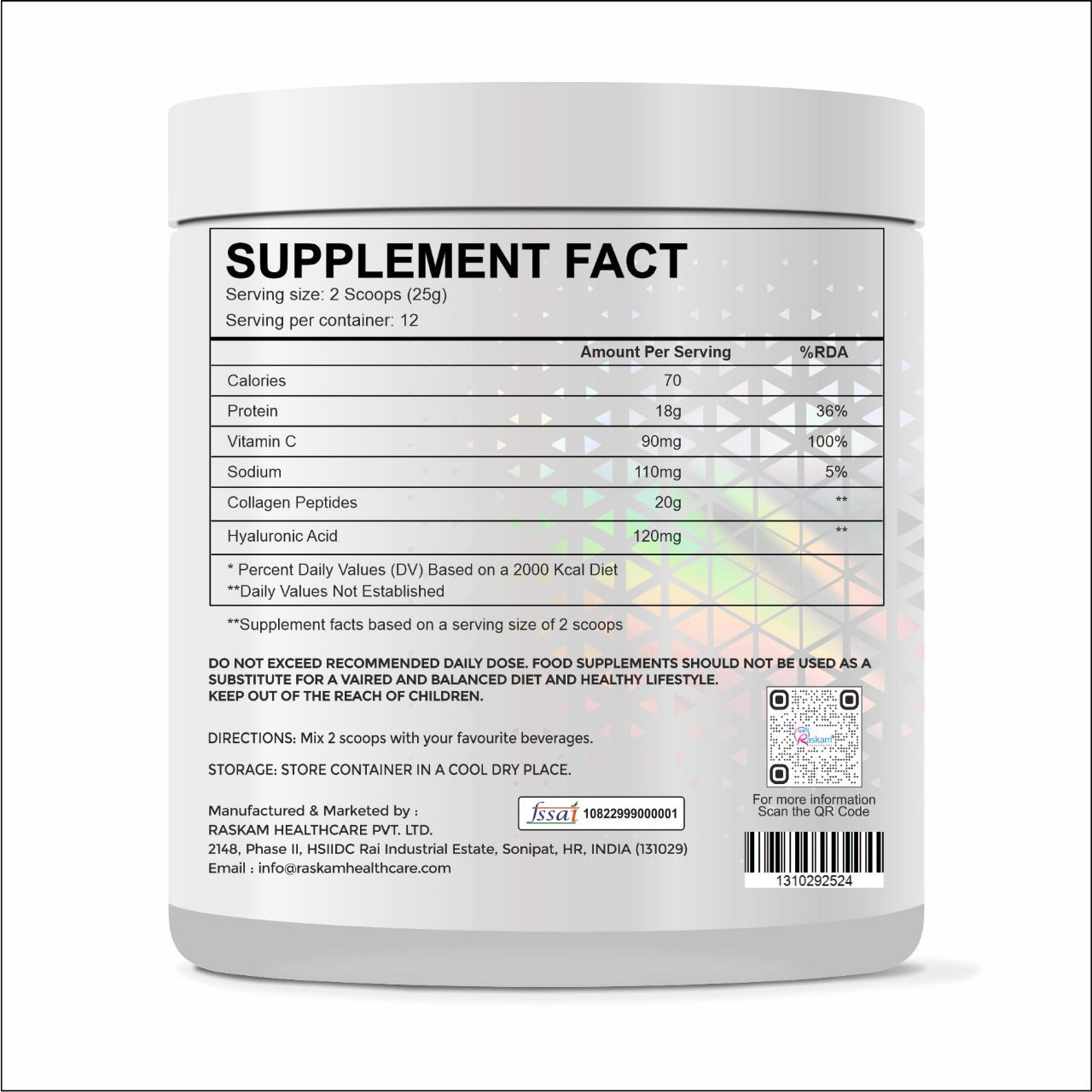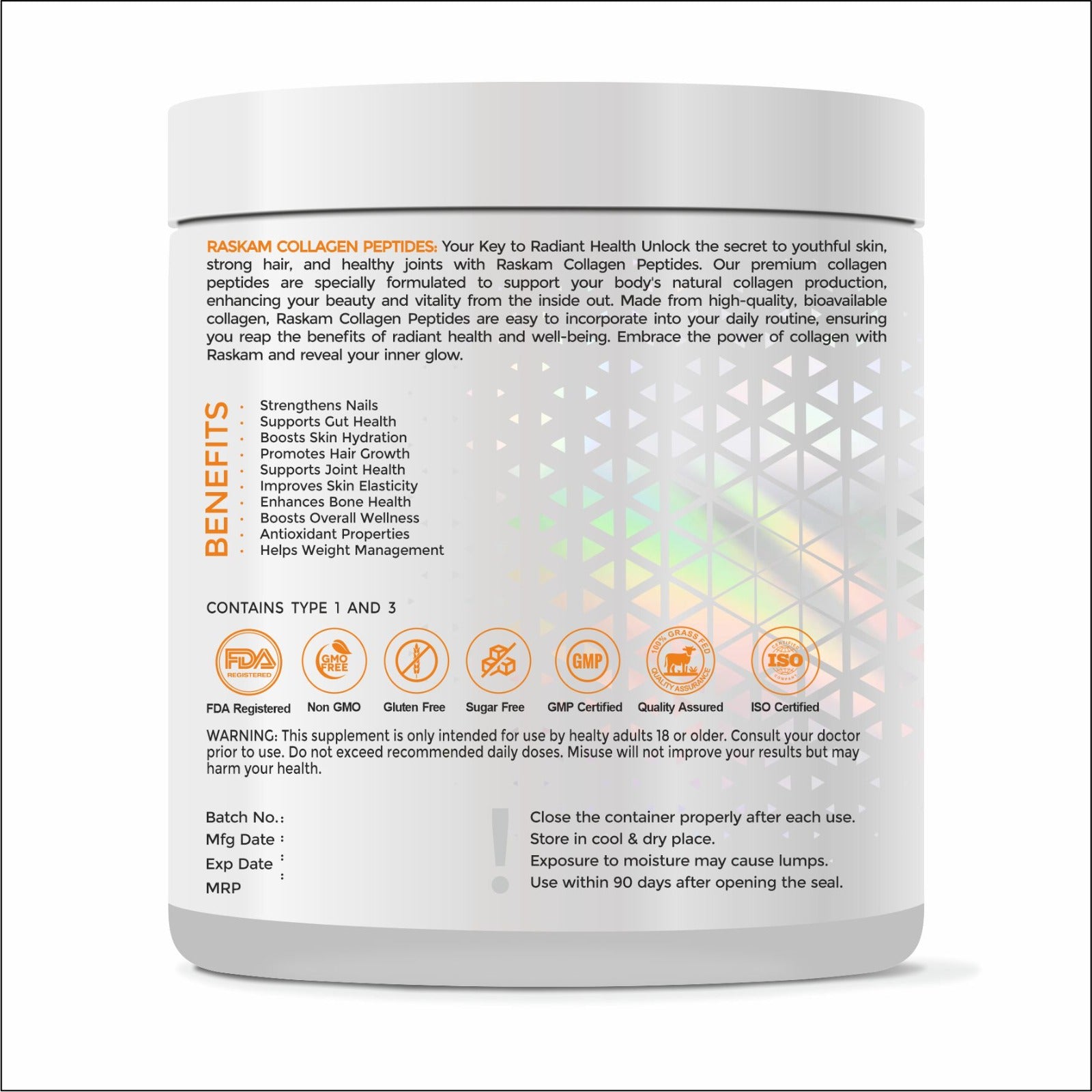 Transform Your Beauty Routine with Raskam Advanced Collagen Peptides Powder! Our cutting-edge formula features high-potency collagen peptides to support skin elasticity, reduce wrinkles, and enhance overall joint and bone health. Each serving delivers essential amino acids and nutrients for a more youthful complexion, stronger hair, and healthier nails. Ideal for daily use, Raskam Advanced Collagen Peptides Powder is your ultimate solution for vibrant, ageless beauty and wellness. Experience the power of advanced collagen and rejuvenate from within!