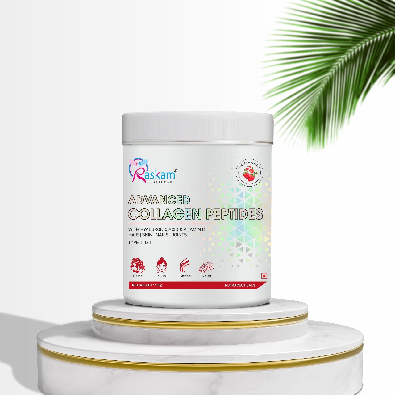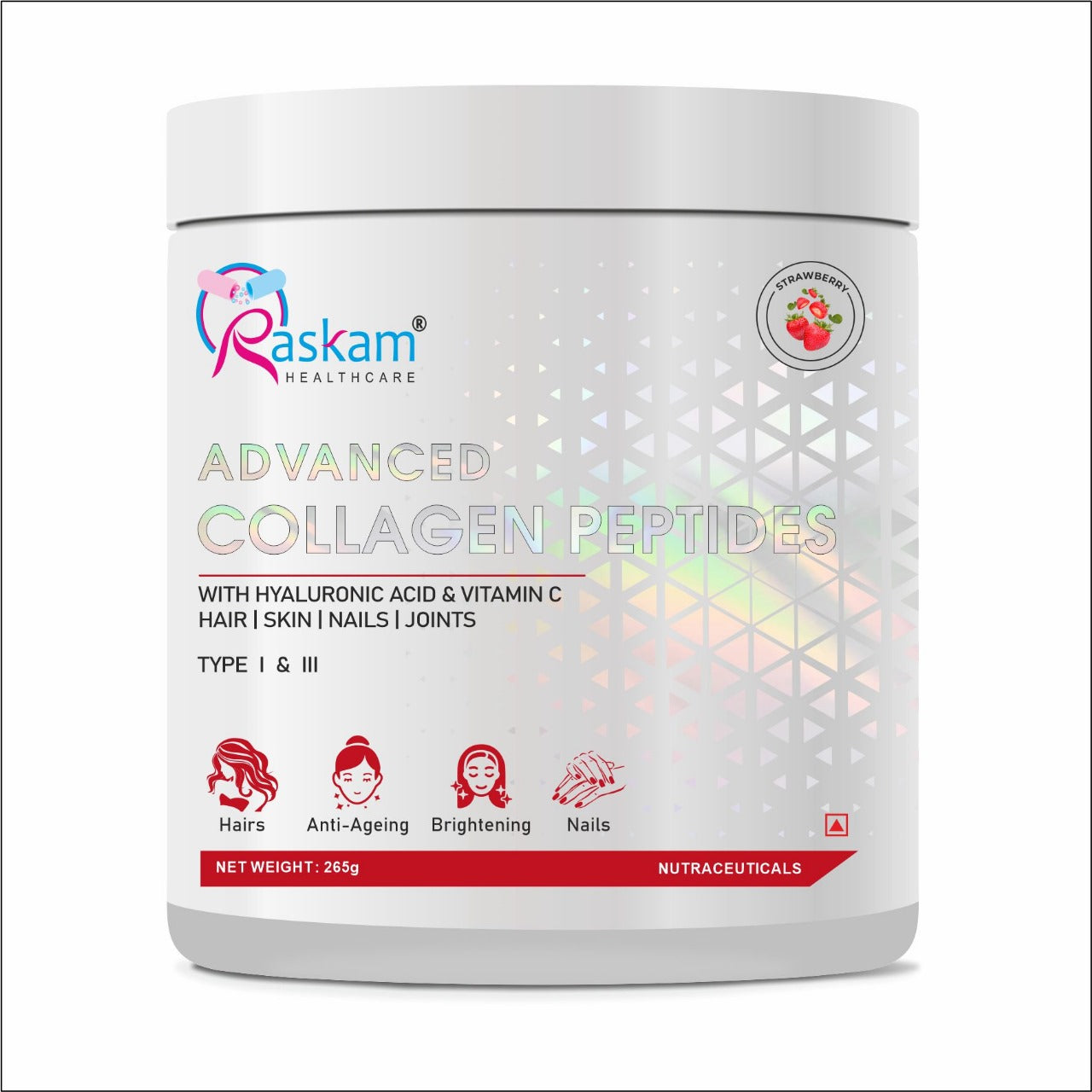 Raskam Advanced Collagen Peptides Powder for Men & Women | Collagen Powder with Biotin, Vitamins C & E for Hair, Nails, Skin Radiance & Anti-Aging Flav- Strawberry (265gm , 100gm)
