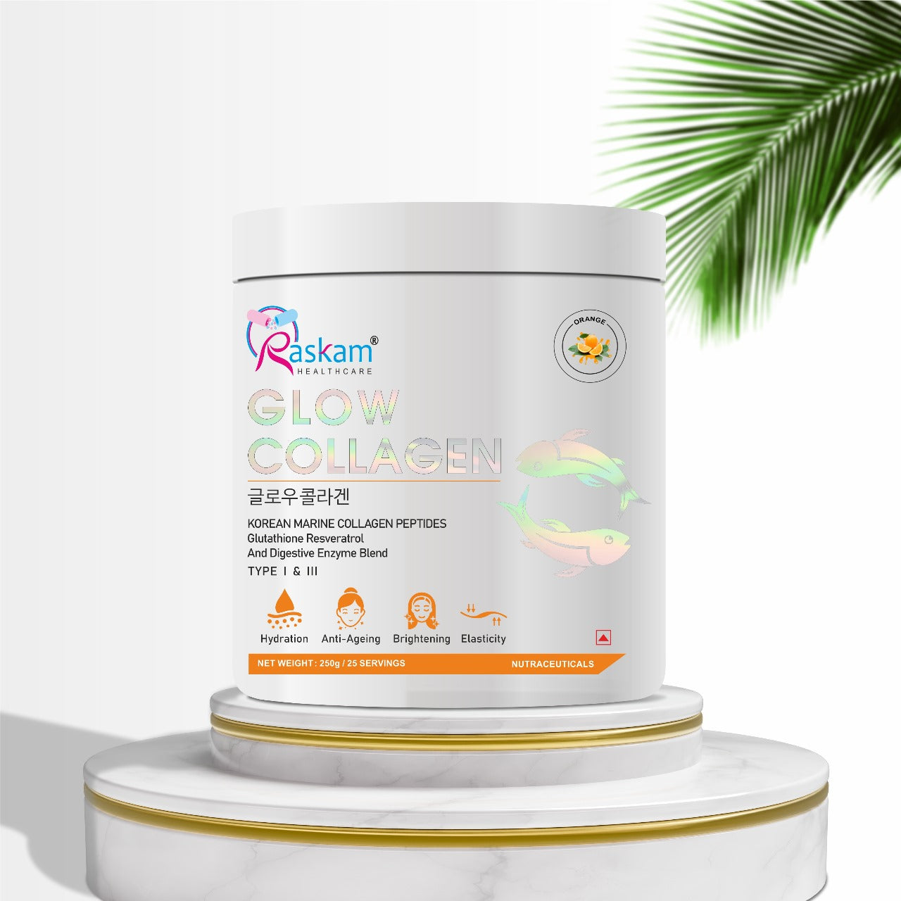Raskam Glow Collagen Peptides Powder for Men & Women | Collagen Powder with Biotin, Vitamins C & E for Hair, Nails, Skin Radiance & Anti-Aging Flav- Orange (100gm , 250 gm)