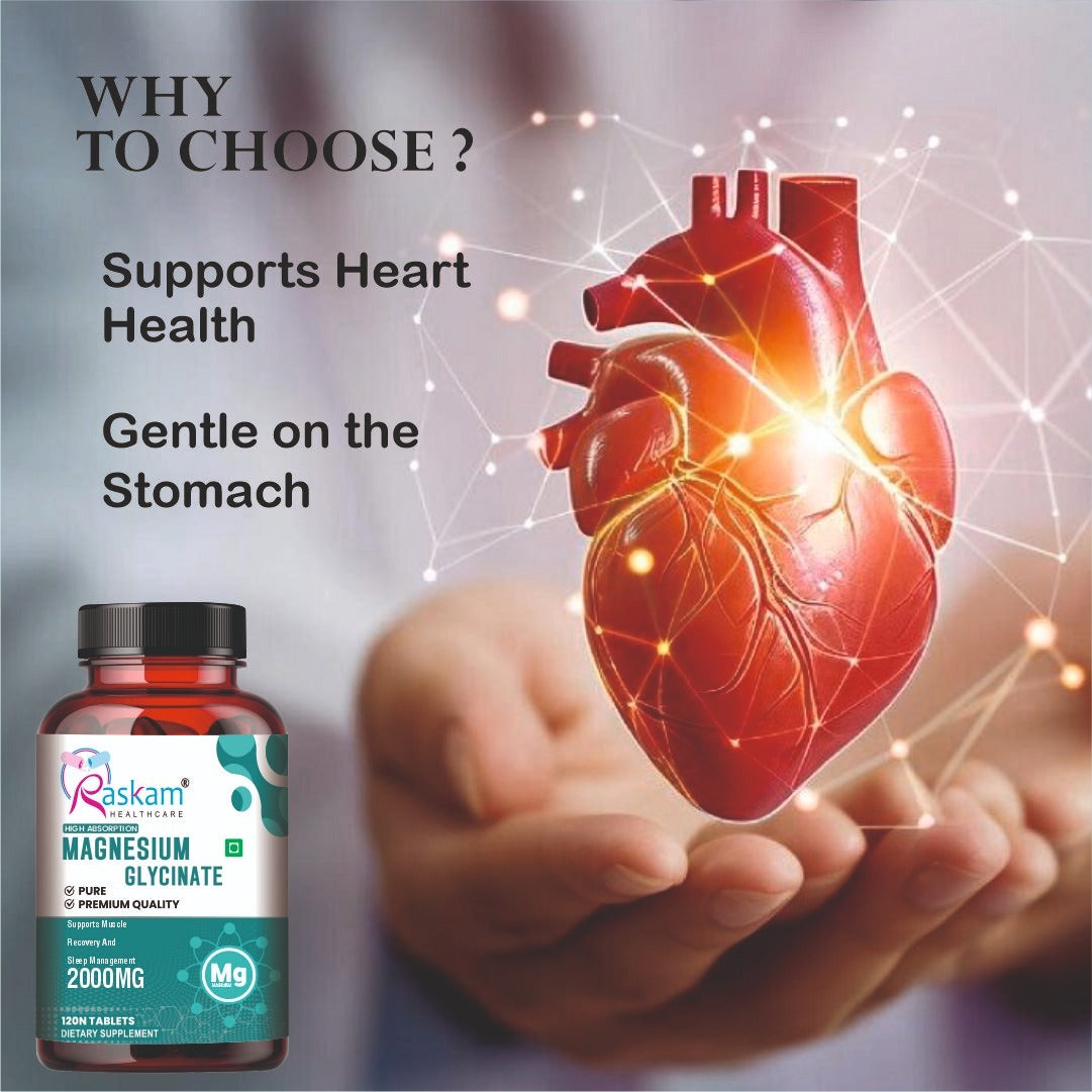 Raskam Magnesium Glycinate, 2000mg per serving, 120 vegetarian tablets, supports muscle recovery, sleep and nerve health