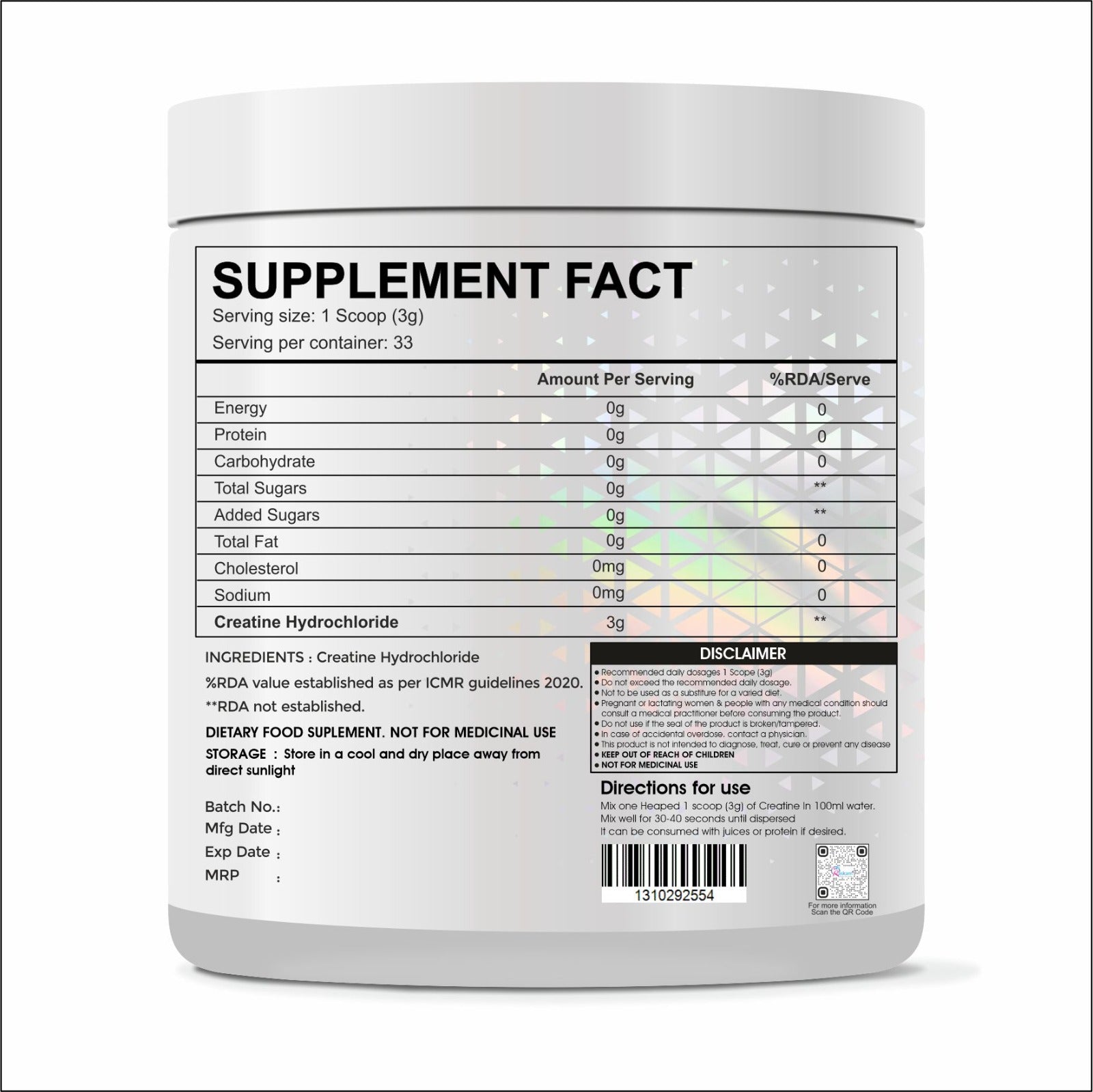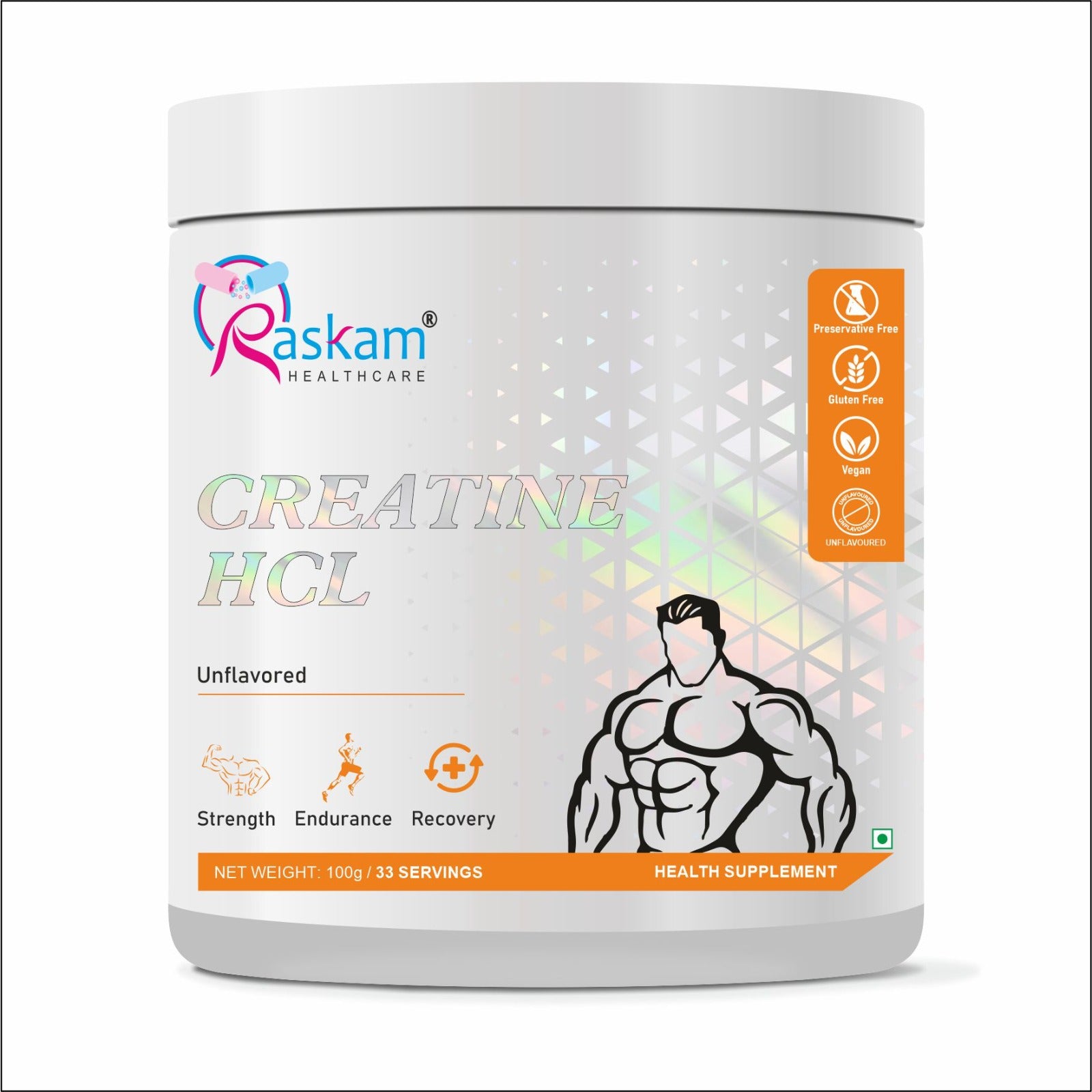 Raskam Pure Creatine HCL Powder (Unflavoured, 33 Sevings) | Rapid Absorption | Enhanced Muscle Strength & Power-100gm