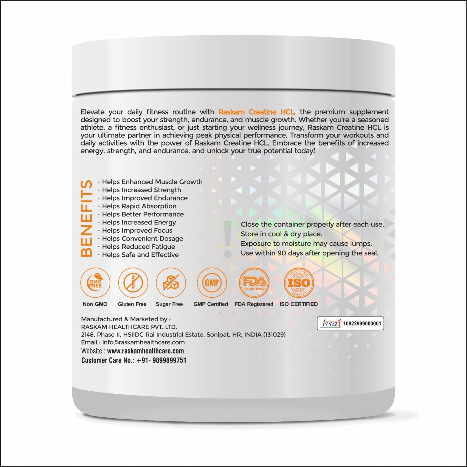 Supercharge Your Workout with Raskam Creatine HCL Powder! Our premium formula delivers highly soluble and easily absorbed creatine hydrochloride to fuel your muscles and enhance performance. Boost strength, increase endurance, and support rapid recovery with each serving. Perfect for athletes and fitness enthusiasts, this powder helps you achieve peak performance and reach your fitness goals faster. Elevate your training and maximize your results with Raskam Creatine HCL Powder—your ultimate partner in muscle growth and exercise success!